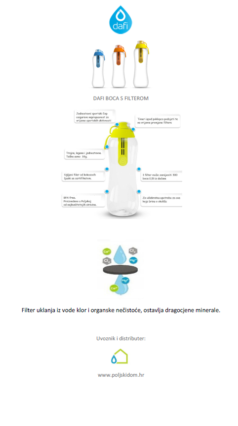 Dafi boca sa filterom zapremnine 0,7l koji uklanja klor, pesticide i organske nečistoće iz vode.