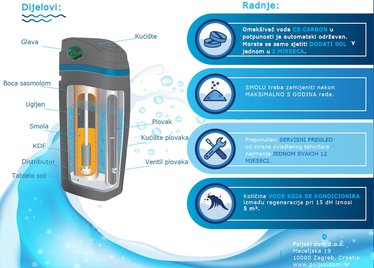 Uređaj CS Carbon kontrolira mikroračunalo koje omogućuje postavljanje parametara rada sustava za obradu vode prilagođenih vašoj vodi. Zahvaljujući tome, uređaj možete koristiti na ekonomičan način, a regeneracija će se odvijati automatski, što štedi vrijeme i novac.